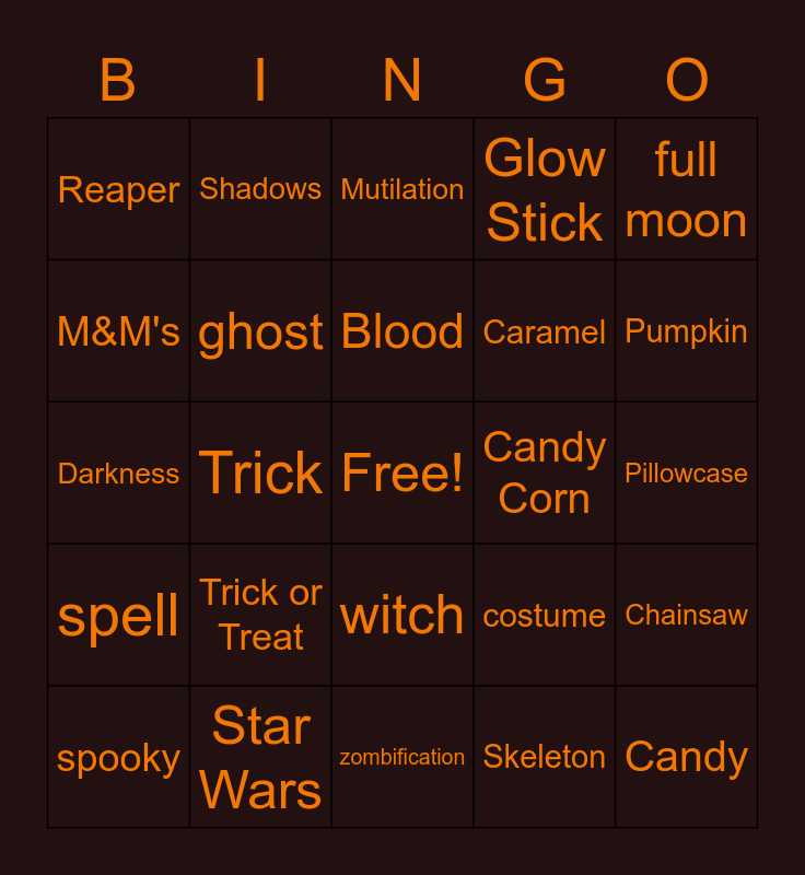 This bingo card has a free space and 29 words: spooky, Math, Trick, Thriller, Reaper, Mutilation, ghost, Trick or Treat, Candy Corn, Star Wars, Pillowcase, Candy, zombification, Skeleton, Pumpkin, Boo, witch, spell, full moon, Darkness, costume, Headless Horseman, Caramel, M&M's, Glow Stick, Shadows, Chainsaw, Blood and Mummy.