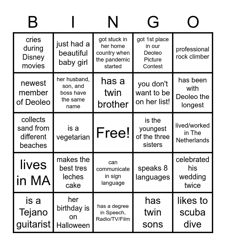 This bingo card has a free space and 24 words: makes the best tres leches cake, her birthday is on Halloween, has a twin brother, is a Tejano guitarist, professional rock climber, cries during Disney movies, newest member of Deoleo, just had a beautiful baby girl, is the youngest of the three sisters, can communicate in sign language, you don't want to be on her list!, collects sand from different beaches, speaks 8 languages, celebrated his wedding twice, her husband, son, and boss have the same name, has twin sons, lived/worked in The Netherlands, got stuck in her home country when the pandemic started, has been with Deoleo the longest, is a vegetarian, likes to scuba dive, lives in MA, got 1st place in our Deoleo Picture Contest and has a degree in Speech, Radio/TV/Film.
