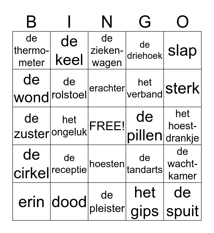 This bingo card has a free space and 24 words: de receptie, dood, erachter, erin, slap, de thermo-meter, de wond, de keel, de pillen, hoesten, het verband, de zuster, de tandarts, de wacht- kamer, de rolstoel, het gips, het hoest-drankje, de zieken-wagen, sterk, het ongeluk, de spuit, de cirkel, de driehoek and de pleister.
