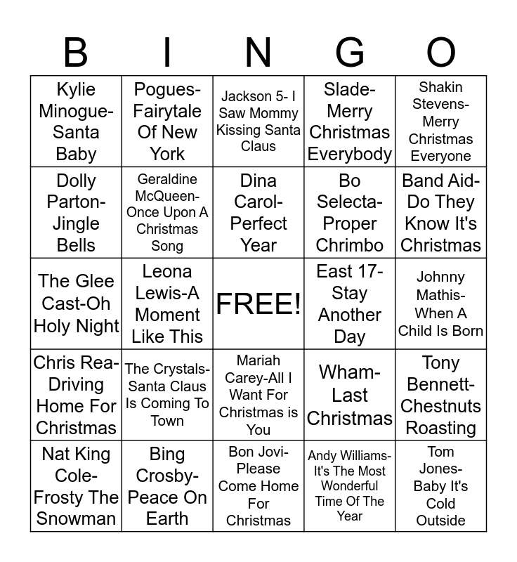 This bingo card has a free space and 45 words: Bill Nighy-Christmas Is All Around, Tom Jones-Baby It's Cold Outside, Greg Lake-I Believe In Father Christmas, Nat King Cole-Frosty The Snowman, Wizzard-I Wish It Could Be Christmas Everyday, Andy Williams-It's The Most Wonderful Time Of The Year, Jackson 5- I Saw Mommy Kissing Santa Claus, The Ronettes-Sleigh Ride, Shakin Stevens-Merry Christmas Everyone, Bing Crosby-Peace On Earth, Slade-Merry Christmas Everybody, East 17-Stay Another Day, Mariah Carey-All I Want For Christmas is You, The Crystals-Santa Claus Is Coming To Town, Elton John-Step Into Christmas, Bon Jovi-Please Come Home For Christmas, Girls Aloud-Jingle Bell Rock, The Glee Cast-Oh Holy Night, Kim Wilde-Rocking Around The Christmas Tree, Band Aid-Do They Know It's Christmas, Pogues-Fairytale Of New York, Michael Buble-White Christmas, Elvis Presley-Blue Christmas, Kylie Minogue-Santa Baby, S Club 7-Perfect Christmas, Johnny Mathis-When A Child Is Born, The Cadillacs-Rudolph The Red Nose Reindeer, David Essex-A Winters Tale, Wham-Last Christmas, Chris Rea-Driving Home For Christmas, Paul McCartney-Wonderful Christmas Time, Tony Bennett-Chestnuts Roasting, Mud-Lonely This Christmas, Frankie Goes To Hollywood-The Power Of Love, Westlife-I Have A Dream, Leona Lewis-A Moment Like This, Cliff Richard-Mistletoe & Wine, Chris De Burgh-A Spaceman Came Travelling, Alexandra Burke-Hallelujah, Dina Carol-Perfect Year, Dolly Parton-Jingle Bells, Bo Selecta-Proper Chrimbo, Leon Jackson-When You Believe, Geraldine McQueen-Once Upon A Christmas Song and Aled Jones-Walking In The Air.