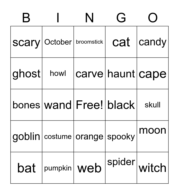 This bingo card has a free space and 24 words: costume, pumpkin, carve, bat, candy, scary, ghost, October, black, orange, haunt, bones, spooky, moon, howl, spider, skull, broomstick, cape, wand, witch, goblin, cat and web.