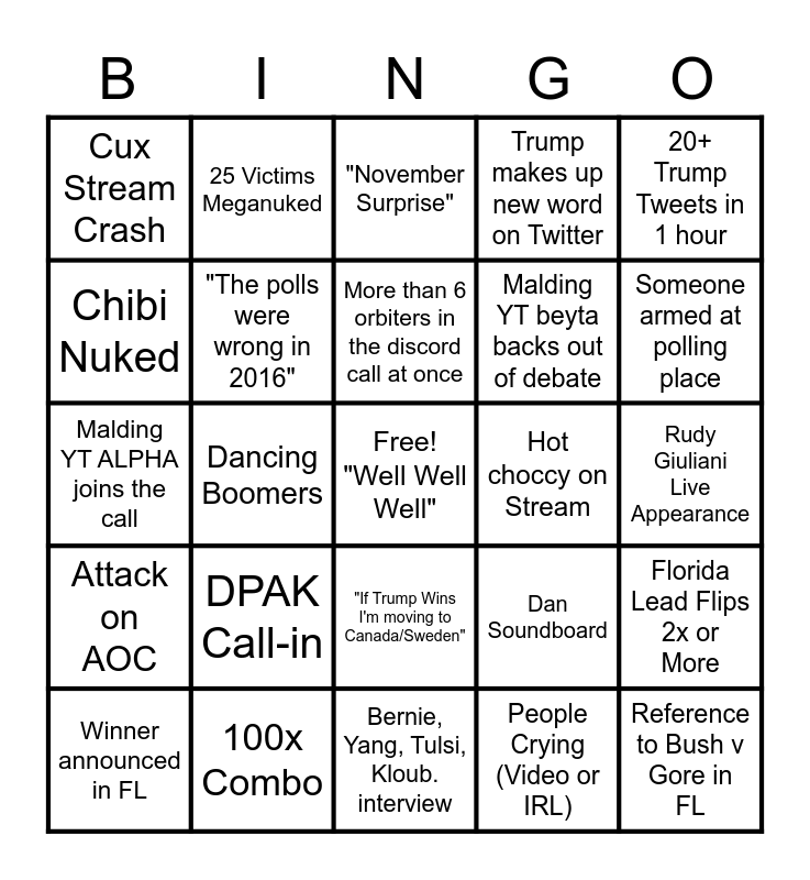 This bingo card has a free space and 24 words: DPAK Call-in, 100x Combo, More than 6 orbiters in the discord call at once, Winner announced in FL, 20+ Trump Tweets in 1 hour, Cux Stream Crash, Chibi Nuked, 25 Victims Meganuked, Hot choccy on Stream, "If Trump Wins I'm moving to Canada/Sweden", Malding YT beyta backs out of debate, Malding YT ALPHA joins the call, Dan Soundboard, Florida Lead Flips 2x or More, "The polls were wrong in 2016", People Crying (Video or IRL), Rudy Giuliani Live Appearance, "November Surprise", Someone armed at polling place, Dancing Boomers, Reference to Bush v Gore in FL, Attack on AOC, Trump makes up new word on Twitter and Bernie, Yang, Tulsi, Kloub. interview.