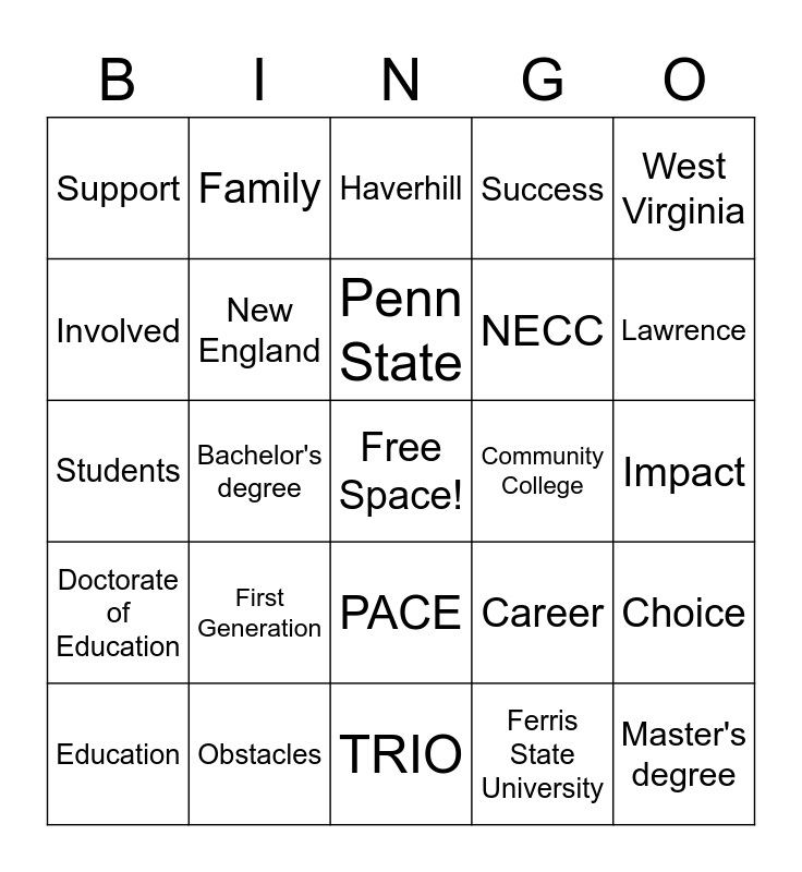 This bingo card has a free space and 24 words: First Generation, Obstacles, Penn State, Education, West Virginia, Support, Involved, Family, Community College, PACE, NECC, Students, Career, Choice, New England, Ferris State University, Impact, Haverhill, Lawrence, Bachelor's degree, Master's degree, Doctorate of Education, Success and TRIO.