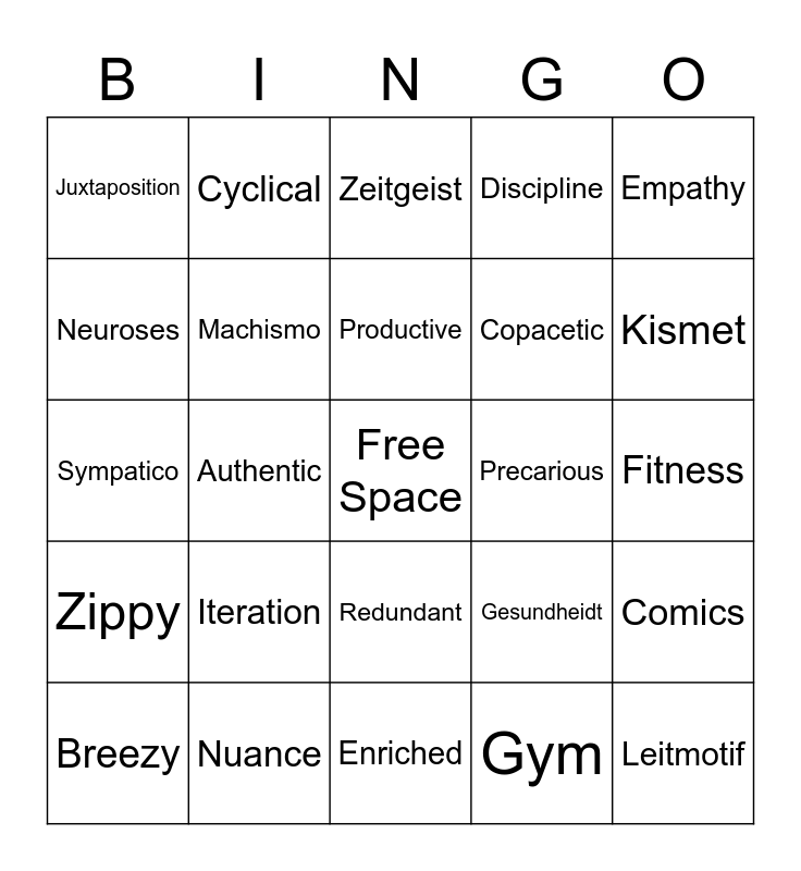 This bingo card has a free space and 24 words: Iteration, Nuance, Productive, Breezy, Empathy, Juxtaposition, Neuroses, Cyclical, Precarious, Redundant, Copacetic, Sympatico, Gesundheidt, Comics, Machismo, Gym, Fitness, Zeitgeist, Kismet, Authentic, Leitmotif, Zippy, Discipline and Enriched.