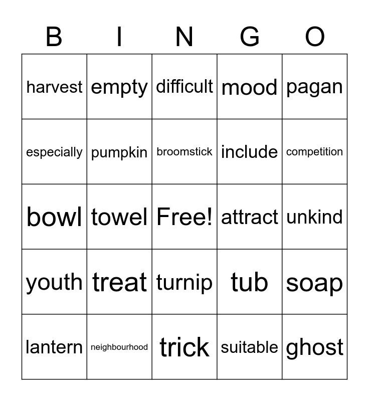 This bingo card has a free space and 25 words: treat, trick, broomstick, lantern, pagan, harvest, especially, empty, attract, turnip, include, bowl, tub, soap, pumpkin, adult, unkind, difficult, competition, towel, ghost, neighbourhood, youth, mood and suitable.