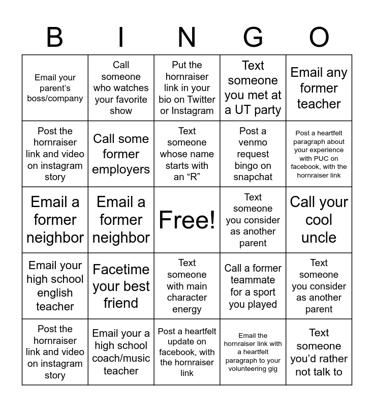 This bingo card has a free space and 100 words: Text someone whose name starts with an “A”, Text someone that you’ve had an awkward hookup with, Call your cool uncle, Text someone whose name starts with an “J”, Post a picture and hornraiser link on your snapchat story, Call someone with a weird allergy, Call your hairdresser/barber, Call someone with terrible music taste, Text someone you haven’t seen since high school ended, Tweet “favorite this if I can venmo request you”, Call a former teammate for a sport you played, Text someone whose name starts with an “T”, Present our project at a group meeting for a club/org you’re in, Email your a high school coach/music teacher, Email any former teacher, Tweet something funny about PUC with the hornraiser link, Post a venmo request bingo on snapchat, Text some former coworkers, Text someone whose name starts with an “M”, Text someone with amazing pop culture taste, Post a venmo request bingo on instagram story, Post a “how much can I venmo request you?” poll on instagram, Knock on your neighbor’s door, Tweet something heartfelt about your experience with PUC, with a hornraiser link, Email your high school calc teacher, Text someone you consider as another parent, Email any former teacher, Call a former teammate for a sport you played, Call someone who’s 6’ 2” or has 6’ 2” energy, Text a friend you met freshman year, Email a former neighbor, Email your parent’s boss/company, Post an update on Linkedin in a super conceited/technical way, Post on Linkedin in a super conceited/technical way, Email the hornraiser link with a heartfelt paragraph to your volunteering gig, Text someone whose name starts with an “R”, Text someone you consider as another parent, Text someone you used to date, Send the hornraiser link to the groupme for your favorite club/org, Post the hornraiser link and video on instagram story, Text a high school friend, Post a venmo request bingo on instagram story, Email a former neighbor, Text a high school friend, Post a heartfelt paragraph about your experience with PUC on facebook, with the hornraiser link, Put the hornraiser link in your bio on Twitter or Instagram, Post a “how much can I venmo request you?” poll on instagram, Text somebody without using a “t” in your entire message (except the link), Knock on your neighbor’s door, Post a heartfelt update on facebook, with the hornraiser link, Call your homecoming/prom date from senior year, Text a family friend with deep pockets, Text someone you met at a UT party, Tweet “favorite this if I can venmo request you”, Tweet something heartfelt about your experience with PUC, with a hornraiser link, Text a drinking buddy, Text someone with main character energy, Email your high school chemistry teacher, Post a “how much can I venmo request you?” poll on instagram, Text someone you met at a UT party, Text a family friend with deep pockets, Text some former coworkers, Text someone you consider as another parent, Text someone whose name starts with an “S”, Email a pastor/religious leader, Call your aunt, Call someone who’s 5’ 8” or has 5’ 8” energy, Present our project at a group meeting for a club/org you’re in, Send the hornraiser link to the groupme for your favorite club/org, Email the hornraiser link with a heartfelt paragraph to your volunteering gig, Email a pastor/religious leader, Facetime your best friend, Knock on your neighbor’s door, Call someone you haven’t seen since quarantine started, Call your aunt, Tweet something funny about PUC with the hornraiser link, Text somebody without using a “b” in your entire message, Post the hornraiser link and video on instagram story, Post a venmo request bingo on instagram story, Text someone with amazing pop culture taste, Call a former teammate for a sport you played, Text someone you’d rather not talk to, Text somebody without using a “h” in your entire message (except the link), Text someone with main character energy, Text a family friend with deep pockets, Call someone who watches your favorite show, Call your creepy uncle, Post a “how much can I venmo request you?” poll on instagram, Email your high school bio teacher, Email your high school english teacher, Call someone with amazing music taste, Facetime a high school friend, Call some former employers, Post the hornraiser link and video on instagram story, Call some former employers, Tweet something funny about PUC with the hornraiser link, Facetime a high school friend, Text someone whose name ends with a vowel, Text someone you haven’t seen since high school ended and Facetime your weirdest cousin.