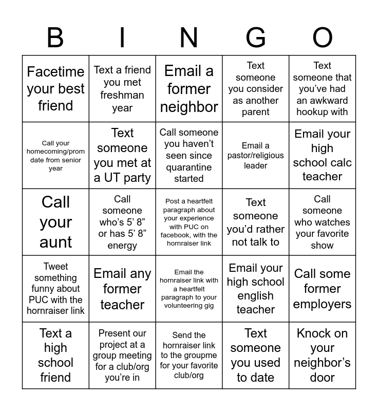 ⚠ This card has duplicate items: Text someone you haven’t seen since high school ended (2), Tweet “favorite this if I can venmo request you” (2), Call a former teammate for a sport you played (3), Present our project at a group meeting for a club/org you’re in (2), Email any former teacher (2), Tweet something funny about PUC with the hornraiser link (3), Text some former coworkers (2), Text someone with amazing pop culture taste (2), Post a venmo request bingo on instagram story (3), Post a “how much can I venmo request you?” poll on instagram (4), Knock on your neighbor’s door (3), Tweet something heartfelt about your experience with PUC, with a hornraiser link (2), Text someone you consider as another parent (3), Email a former neighbor (2), Email the hornraiser link with a heartfelt paragraph to your volunteering gig (2), Send the hornraiser link to the groupme for your favorite club/org (2), Post the hornraiser link and video on instagram story (3), Text a high school friend (2), Text a family friend with deep pockets (3), Text someone you met at a UT party (2), Text someone with main character energy (2), Email a pastor/religious leader (2), Call your aunt (2), Facetime a high school friend (2), Call some former employers (2)