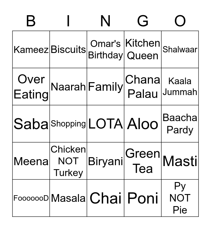 This bingo card has a free space and 24 words: Chicken NOT Turkey, Masala, Family, FooooooD, Shalwaar, Kameez, Over Eating, Biscuits, Aloo, Biryani, Chana Palau, Saba, Green Tea, Masti, Naarah, Poni, Baacha Pardy, Omar's Birthday, Kaala Jummah, Shopping, Py NOT Pie, Meena, Kitchen Queen and Chai.