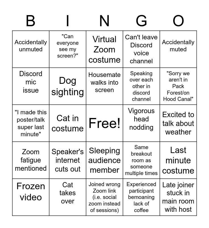 This bingo card has a free space and 24 words: Speaker's internet cuts out, Cat takes over, Housemate walks into screen, Frozen video, Accidentally muted, Accidentally unmuted, Discord mic issue, "Can everyone see my screen?", Vigorous head nodding, Sleeping audience member, Speaking over each other in discord channel, "I made this poster/talk super last minute", Same breakout room as someone multiple times, Last minute costume, Dog sighting, Experienced participant bemoaning lack of coffee, Excited to talk about weather, Virtual Zoom costume, "Sorry we aren't in Pack Forest/on Hood Canal", Cat in costume, Late joiner stuck in main room with host, Zoom fatigue mentioned, Can't leave Discord voice channel and Joined wrong Zoom link (i.e. social zoom instead of sessions).