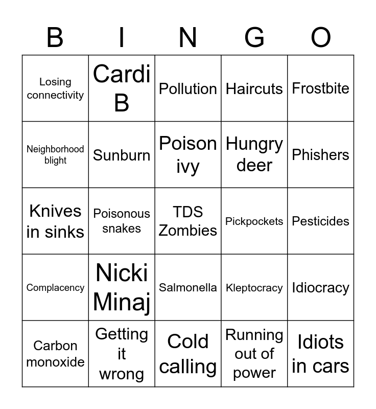 This bingo card has 46 words: Clowns, TDS Zombies, Leprosy, Cold calling, Nicki Minaj, Lady Gaga, Cardi B, The Exorcist, Neighborhood blight, Ticks, Sunburn, Haircuts, Idiocracy, Kleptocracy, Grizzly bears, Pumas, Poison ivy, Pickpockets, Demagogues, Frostbite, Poisonous snakes, Running out of power, Losing connectivity, Hungry deer, Hungry woodchucks, Phishers, Carbon monoxide, Pushy salespeople, Salmonella, Complacency, Mushrooms, Yeast extract, Corporate employment, Disease talk, Missing out, Getting it wrong, Pesticides, Global warming, Losing endangered species, The singularity, Idiots in cars, Pollution, Knives in sinks, Senility, Ebola and Needy women.