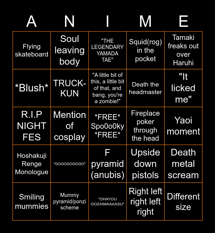 This bingo card has a free space and 42 words: Legendary biker boss, "A little bit of this, a little bit of that, and bang, you're a zombie!", *Downspout intensifies*, "GOGOGOGOGO", Right left right left right, Death metal scream, Different size, Inchou screams like a girl, "THE LEGENDARY YAMADA TAE", F pyramid (anubis), Yaoi moment, "It licked me", Mention of cosplay, Tamaki freaks out over Haruhi, "Daddy", Upside down pistols, Zombie doggo, R.I.P NIGHT FES, Clock tower rings, Soul leaving body, *Blush*, Going below zero..., "To save Saga", Flying skateboard, "I'm gonna be the girl I want to be!", Roses, Death the headmaster, "Symmetrical" pharaoh, "Symmetry, that is aesthetic", Freaky moon/Freaky sun, Beelzenef(cat puppet) wiggle, Hoshakuji Renge Monologue, TRUCK-KUN, "OHAYOU GOZAIMAAAASU", Zombie headbang, Smiling mummies, Mummy pyramid/ponzi scheme, Fireplace poker through the head, "Omae no tamashi, itadaku yo!", "You mean I'm not a piece of garbage?” (heap of trash), Squid(rog) in the pocket and Hikaru and Kaoru speaking in sync.