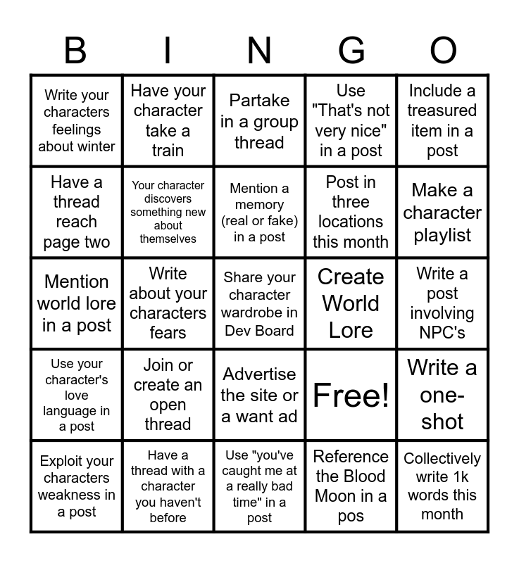This bingo card has 25 words: Join or create an open thread, Use "you've caught me at a really bad time" in a post, Mention a memory (real or fake) in a post, Exploit your characters weakness in a post, Include a treasured item in a post, Write your characters feelings about winter, Have a thread reach page two, Have your character take a train, Create World Lore, Advertise the site or a want ad, Post in three locations this month, Mention world lore in a post, Free!, Write a one-shot, Your character discovers something new about themselves, Collectively write 1k words this month, Write a post involving NPC's, Partake in a group thread, Make a character playlist, Write about your characters fears, Share your character wardrobe in Dev Board, Have a thread with a character you haven't before, Use your character's love language in a post, Use "That's not very nice" in a post and Reference the Blood Moon in a pos.