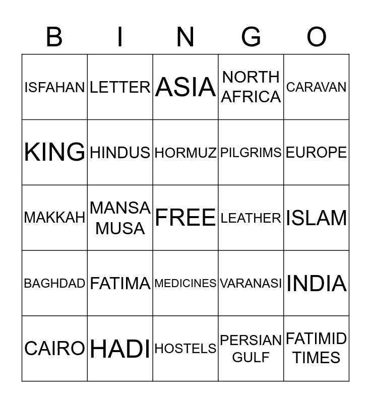 This bingo card has a free space and 24 words: FATIMA, HADI, HORMUZ, CAIRO, CARAVAN, ISFAHAN, KING, LETTER, LEATHER, MEDICINES, PILGRIMS, MAKKAH, VARANASI, INDIA, HINDUS, PERSIAN GULF, ISLAM, ASIA, EUROPE, MANSA MUSA, FATIMID TIMES, BAGHDAD, NORTH AFRICA and HOSTELS.