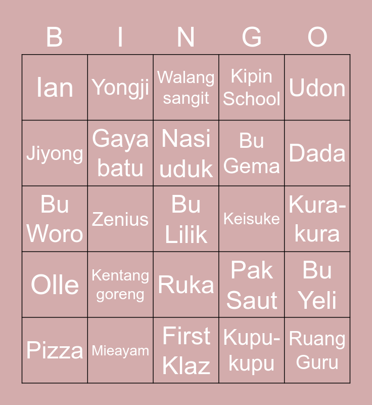 This bingo card has a free space and 24 words: Kentang goreng, Mieayam, Nasi uduk, Pizza, Udon, Ian, Jiyong, Yongji, Keisuke, Ruka, Bu Gema, Bu Woro, Pak Saut, Bu Yeli, Gaya batu, Kupu-kupu, Kura-kura, Walang sangit, Dada, Zenius, Ruang Guru, Olle, Kipin School and First Klaz.