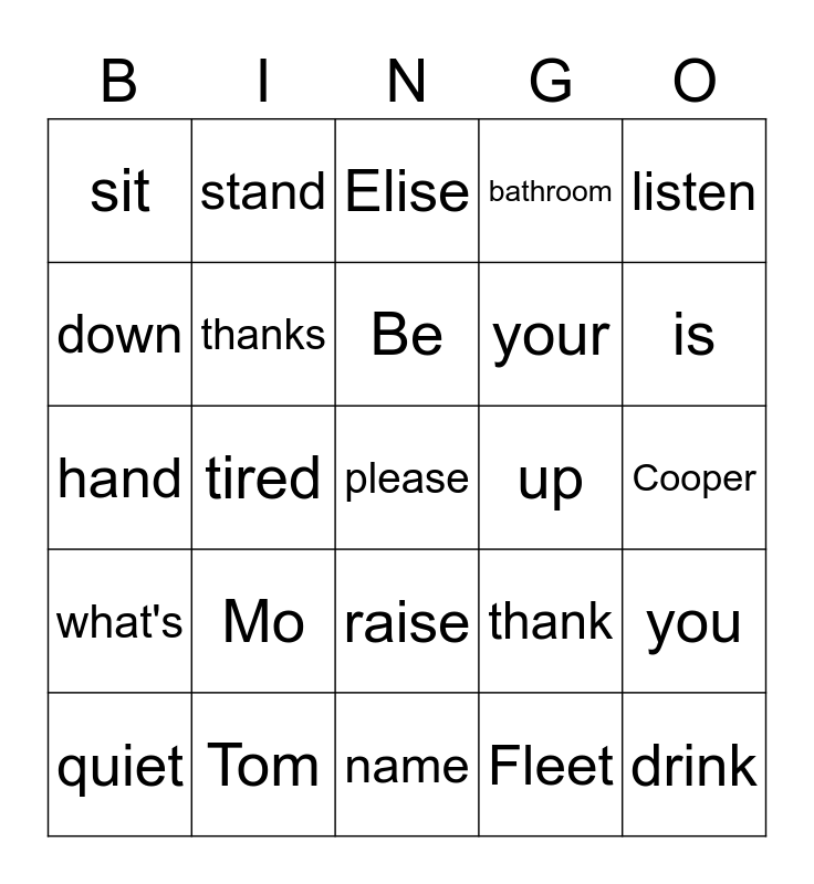 This bingo card has a free space and 24 words: Mo, Tom, Be, quiet, listen, sit, down, stand, up, raise, your, hand, thank, you, thanks, Fleet, Cooper, Elise, is, tired, drink, what's, bathroom and name.