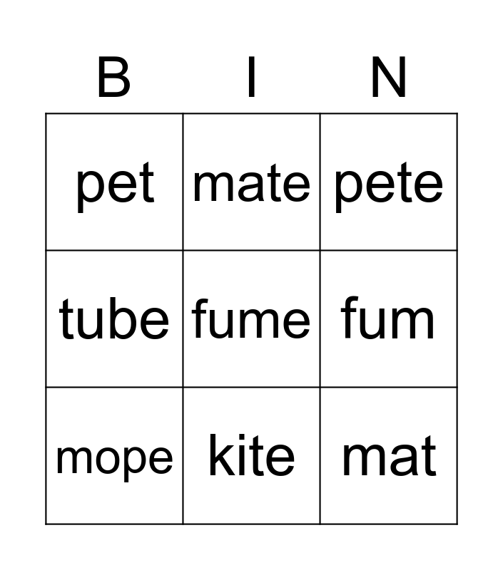 This bingo card has a free space and 8 words: fum, pete, mate, mope, pet, mat, tube and kite.