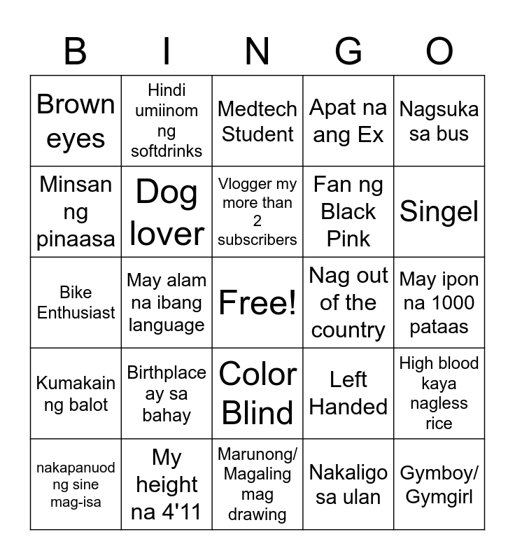 This bingo card has a free space and 24 words: Birthplace ay sa bahay, My height na 4'11, Vlogger my more than 2 subscribers, nakapanuod ng sine mag-isa, Nagsuka sa bus, Brown eyes, Minsan ng pinaasa, Hindi umiinom ng softdrinks, Nag out of the country, Color Blind, Fan ng Black Pink, Bike Enthusiast, Left Handed, High blood kaya nagless rice, Dog lover, Nakaligo sa ulan, May ipon na 1000 pataas, Medtech Student, Singel, May alam na ibang language, Gymboy/ Gymgirl, Kumakain ng balot, Apat na ang Ex and Marunong/ Magaling mag drawing.