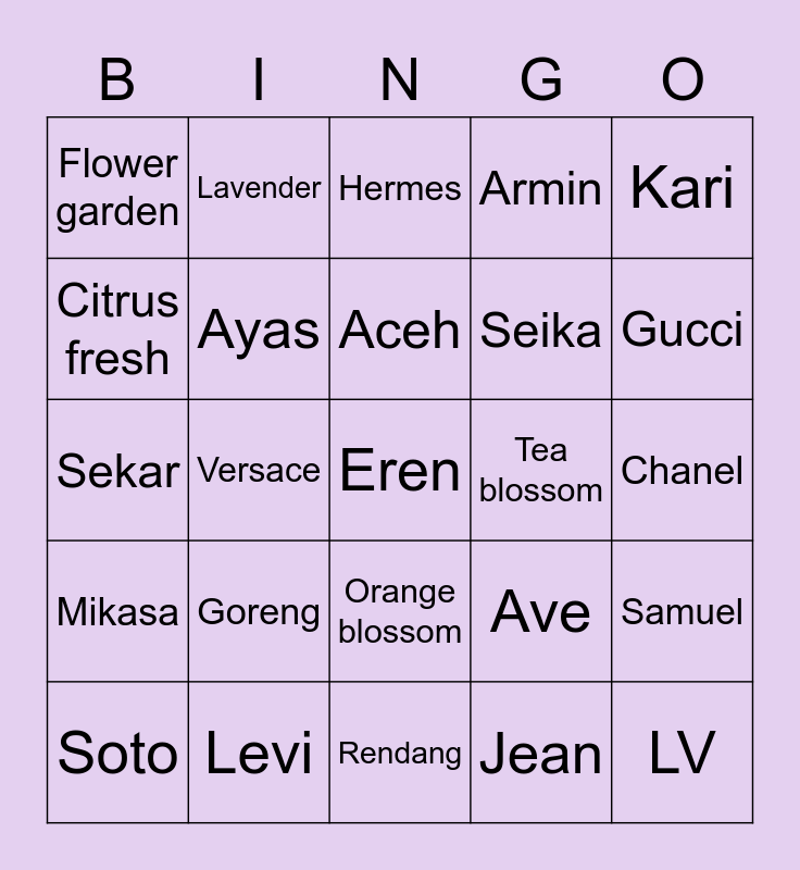 This bingo card has 25 words: Goreng, Rendang, Aceh, Soto, Kari, Flower garden, Citrus fresh, Lavender, Tea blossom, Orange blossom, Seika, Sekar, Ave, Samuel, Ayas, LV, Chanel, Hermes, Gucci, Versace, Eren, Levi, Mikasa, Armin and Jean.