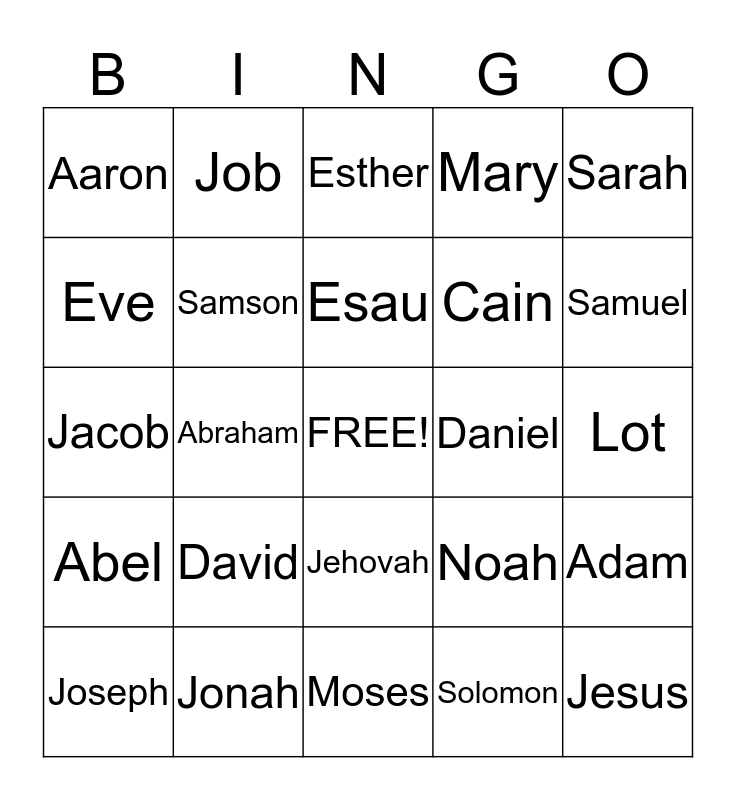 This bingo card has a free space and 24 words: David, Jonah, Esau, Joseph, Sarah, Aaron, Eve, Job, Daniel, Jehovah, Cain, Jacob, Noah, Adam, Samson, Solomon, Lot, Esther, Samuel, Abraham, Jesus, Abel, Mary and Moses.