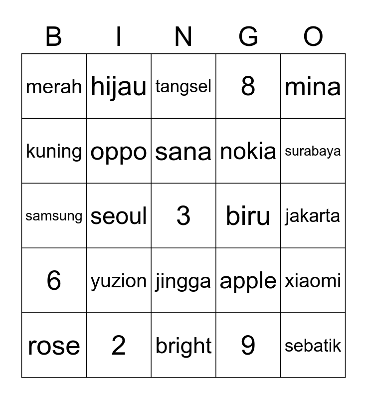 This bingo card has 25 words: yuzion, bright, sana, rose, mina, merah, kuning, hijau, biru, jingga, nokia, samsung, apple, xiaomi, oppo, sebatik, jakarta, tangsel, surabaya, seoul, 3, 2, 6, 8 and 9.