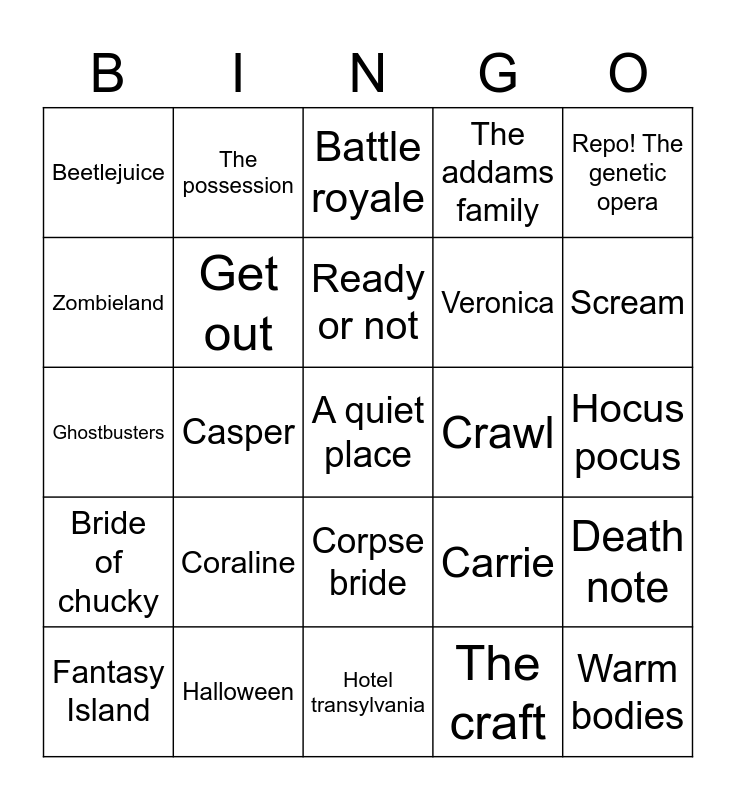 This bingo card has a free space and 24 words: Coraline, Halloween, Ready or not, Fantasy Island, Repo! The genetic opera, Beetlejuice, Zombieland, The possession, Crawl, Corpse bride, Veronica, Ghostbusters, Carrie, Death note, Get out, The craft, Hocus pocus, Battle royale, Scream, Casper, Warm bodies, Bride of chucky, The addams family and Hotel transylvania.
