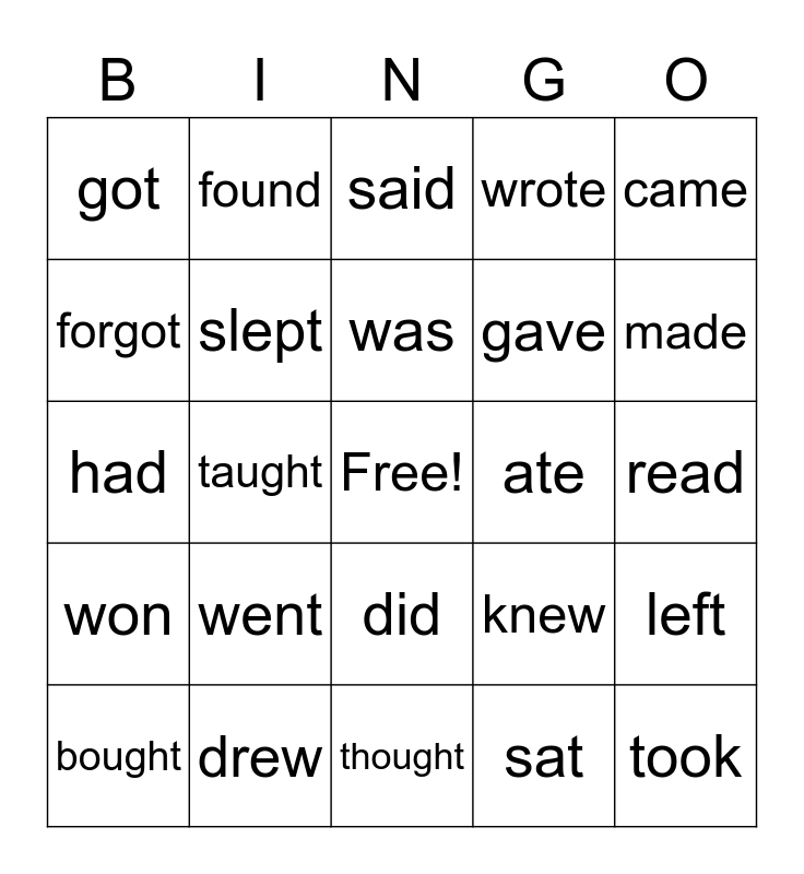 This bingo card has a free space and 24 words: went, drew, was, bought, came, got, forgot, found, ate, did, gave, had, knew, left, slept, sat, read, said, made, taught, took, won, wrote and thought.