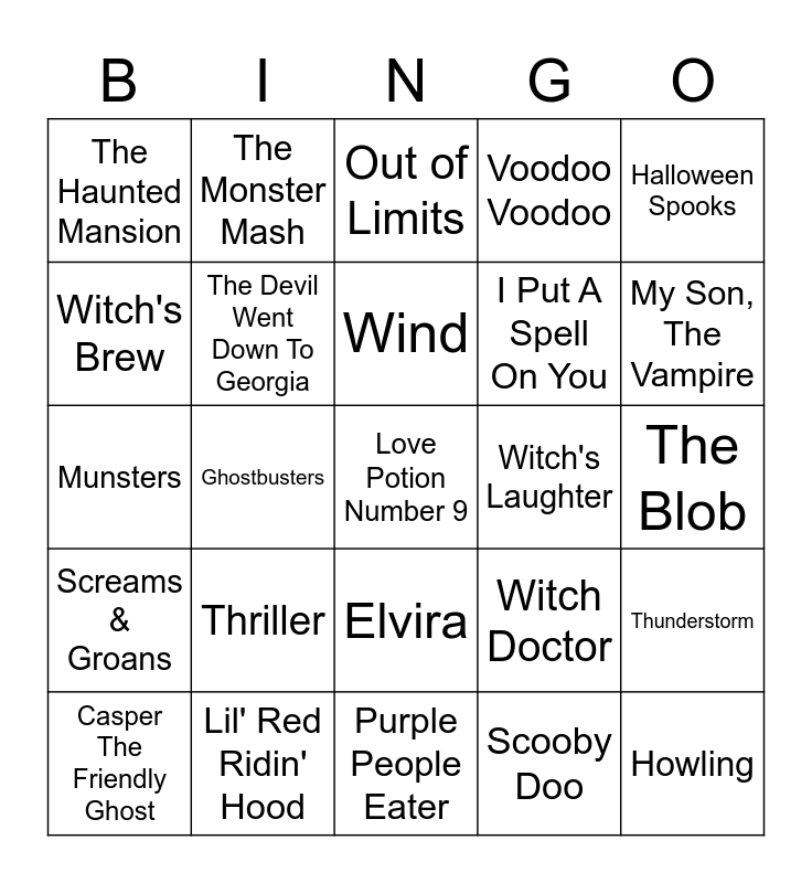 This bingo card has a free space and 29 words: Casper The Friendly Ghost, The Shining, Ghostbusters, Psycho, The Haunted Mansion, Out of Limits, The Devil Went Down To Georgia, Thriller, Witch's Laughter, Lil' Red Ridin' Hood, The Blob, Howling, Purple People Eater, Scooby Doo, My Son, The Vampire, The Addams Family, Elvira, Screams & Groans, Halloween Spooks, Munsters, Witch Doctor, Cat Fight, I Put A Spell On You, Witch's Brew, Voodoo Voodoo, The Monster Mash, Thunderstorm, Wind and Owl.