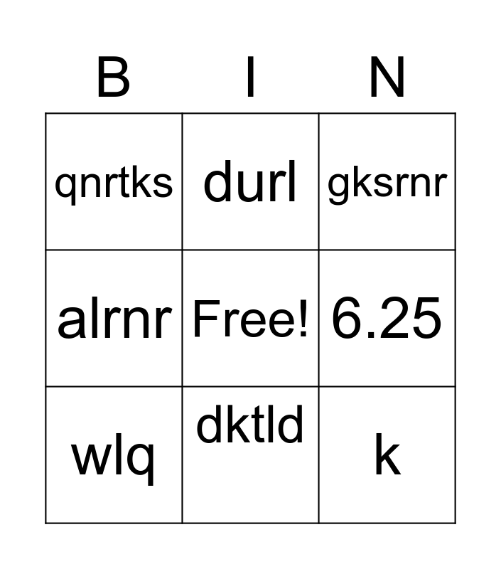 This bingo card has a free space and 8 words: 6.25, gksrnr, durl, wlq, qnrtks, k, alrnr and dktld.