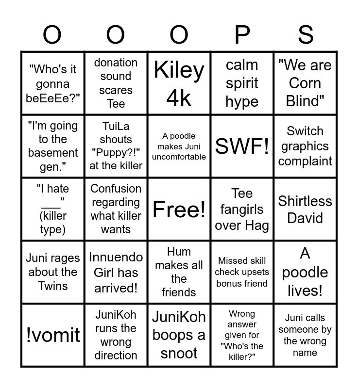 This bingo card has a free space and 50 words: Guests mix up who is playing, Juni calls someone by the wrong name, MamaKoh lives!, JuniKoh boops a snoot, Innuendo Girl has arrived!, Big Hatch Energy!, donation sound scares Tee, "I think they are farming!" ...Nope, "I'm going to the basement gen.", Juni doesn't know slang, TuiLa shouts "Puppy?!" at the killer, calm spirit hype, A poodle lives!, Missed skill check upsets bonus friend, Bargaining with the killer, She lived!, A poodle makes Juni uncomfortable, Tee fangirls over Hag, "Pain, without love!", "We are Corn Blind", Confusion regarding what killer wants, Wrong answer given for "Who's the killer?", "Who's it gonna beEeEe?", SWF!, Successful Kobe, Death on first hook, Switch graphics complaint, Party with Ghostface!, Kiley 4k, Hum makes all the friends, Hum is angry (as killer), "I made a bad choice.", Indiana Jones Theme, Jorca/Orni moment, JuniKoh runs the wrong direction, !dilly, "BT is boring", Self-sacrifice ends in failure, JuniKoh die for their friends, Shirtless David, Jurassic Park Theme, MamaKoh finishes a gen solo, someone spells Kiley wrong, Kiley takes pity, !vomit, "I hate ___" (killer type), Tee downs toxic survivor, Tee 4k, Juni rages about the Twins and Tee plays a different killer than usual.