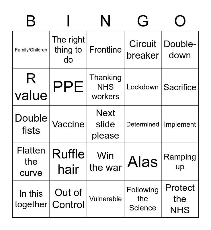This bingo card has 32 words: Following the Science, Christmas, Vaccine, World-beating, Flatten the curve, PPE, Double-down, Ramping up, The right thing to do, Protect the NHS, Thanking NHS workers, Frontline, British public, Economy, Determined, Financial Support, In this together, Double fists, Win the war, Ruffle hair, Alas, Unprecedented, Implement, Out of Control, Next slide please, Circuit breaker, Lockdown, R value, Family/Children, Vulnerable, Personal responsibility and Sacrifice.