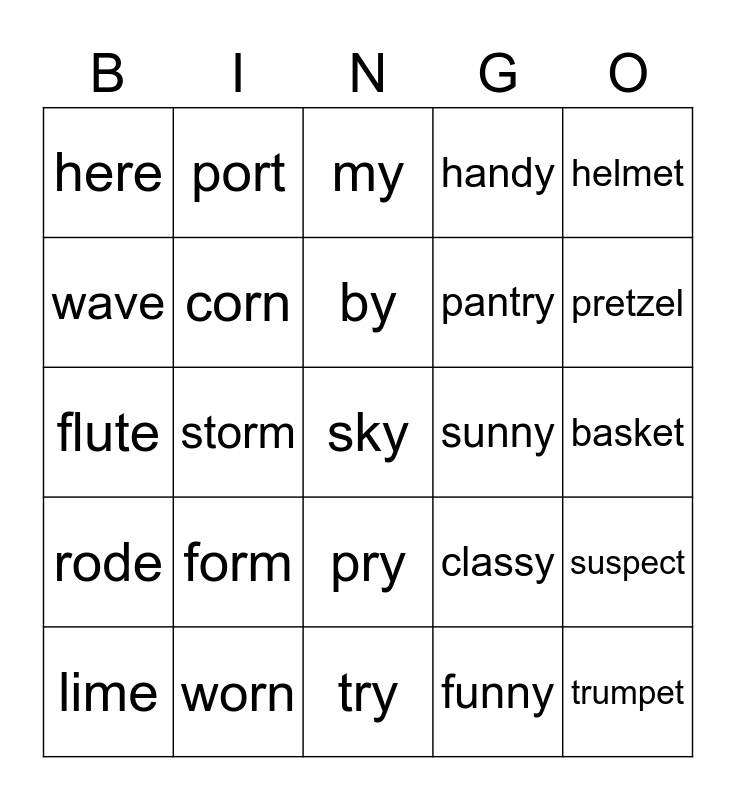This bingo card has a free space and 24 words: lime, form, by, funny, helmet, here, port, my, sunny, basket, flute, corn, classy, suspect, wave, worn, try, handy, pretzel, rode, storm, pry, pantry and trumpet.