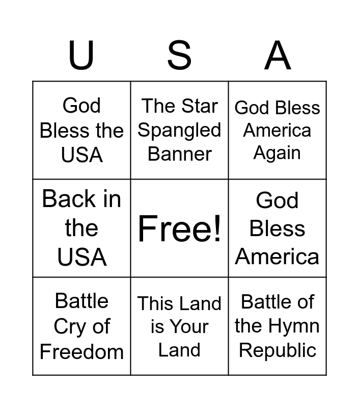 This bingo card has a free space and 24 words: You're a Grand ole Flag, My Country Tis of Thee, This Land is Your Land, America the Beautiful, Battle of the Hymn Republic, God Bless the USA, God Bless America, The Star Spangled Banner, The Army Goes Rolling Along, The Marines' Hymn, Anchors Aweigh, The U.S. Air Force, Semper Paratus, Praise the Lord and Pass the Ammunition, Battle Cry of Freedom, Fanfare for the Common Man, Yankee Doodle, God Bless America Again, God of our Fathers, When Johnny Comes Marching Home Again, There's a Star Spangled Banner Waving Somewhere, This is my Country, Back in the USA and Heaven Watched the Philippines.