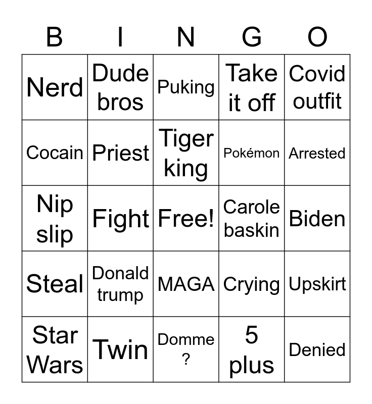This bingo card has a free space and 25 words: Donald trump, Domme ?, Tiger king, Star Wars, Covid outfit, Nerd, Cocain, Dude bros, Carole baskin, MAGA, Pokémon, Nip slip, Crying, Upskirt, Priest, Brutus, Biden, Puking, Arrested, Fight, Denied, Twin, Steal, Take it off and 5 plus.