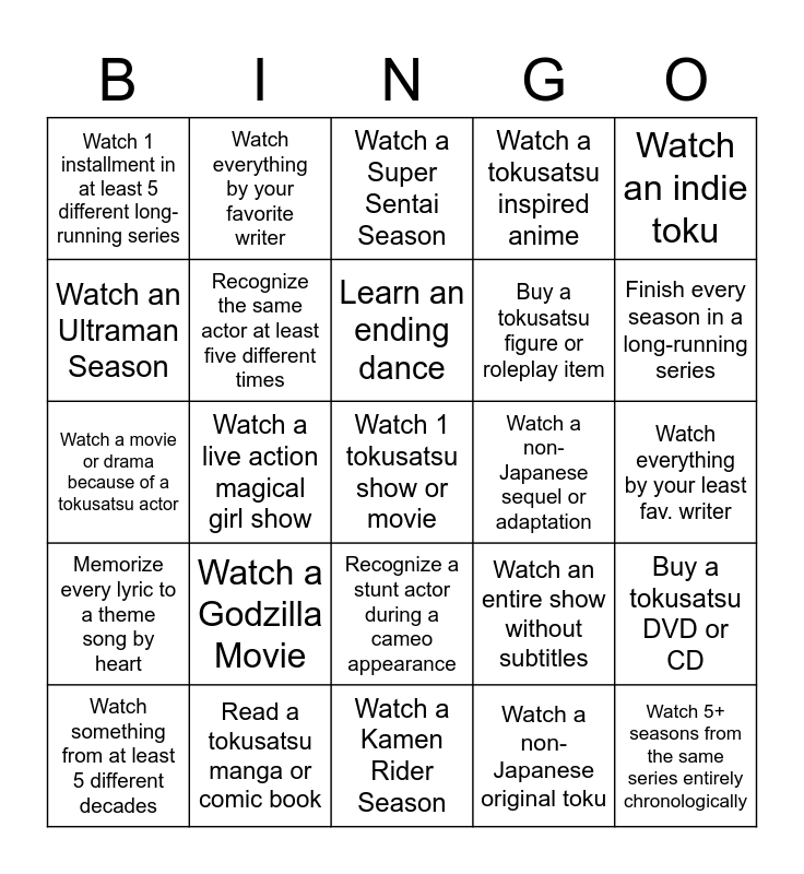 This bingo card has a free space and 24 words: Watch a Godzilla Movie, Read a tokusatsu manga or comic book, Learn an ending dance, Watch something from at least 5 different decades, Watch an indie toku, Watch 1 installment in at least 5 different long-running series, Watch an Ultraman Season, Watch everything by your favorite writer, Watch a non-Japanese sequel or adaptation, Recognize a stunt actor during a cameo appearance, Buy a tokusatsu figure or roleplay item, Watch a movie or drama because of a tokusatsu actor, Watch an entire show without subtitles, Buy a tokusatsu DVD or CD, Recognize the same actor at least five different times, Watch a non-Japanese original toku, Watch everything by your least fav. writer, Watch a Super Sentai Season, Finish every season in a long-running series, Watch a live action magical girl show, Watch 5+ seasons from the same series entirely chronologically, Memorize every lyric to a theme song by heart, Watch a tokusatsu inspired anime and Watch a Kamen Rider Season.