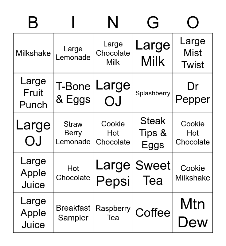 This bingo card has a free space and 25 words: Hot Chocolate, Raspberry Tea, Large OJ, Large Apple Juice, Large Mist Twist, Milkshake, Large Fruit Punch, Large Lemonade, Steak Tips & Eggs, Large Pepsi, Splashberry, Large OJ, Sweet Tea, Cookie Milkshake, T-Bone & Eggs, Milkshake, Cookie Hot Chocolate, Large Chocolate Milk, Dr Pepper, Straw Berry Lemonade, Mtn Dew, Breakfast Sampler, Large Apple Juice, Large Milk and Coffee.