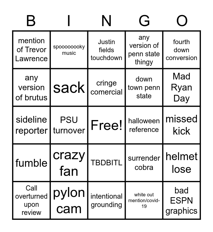 This bingo card has a free space and 29 words: Call overturned upon review, targeting, PSU turnover, Master Teague III td, mention of Trevor Lawrence, Justin fields touchdown, sack, crazy fan, halloween reference, pylon cam, missed kick, bad ESPN graphics, intentional grounding, white out mention/covid-19, Mad Ryan Day, Mad James Franklin, TBDBITL, fumble, fourth down conversion, sideline reporter, surrender cobra, Penn state ice cream, down town penn state, any version of brutus, any version of penn state thingy, spoooooooky music, helmet lose, cringe comercial and Wisconsin cases.