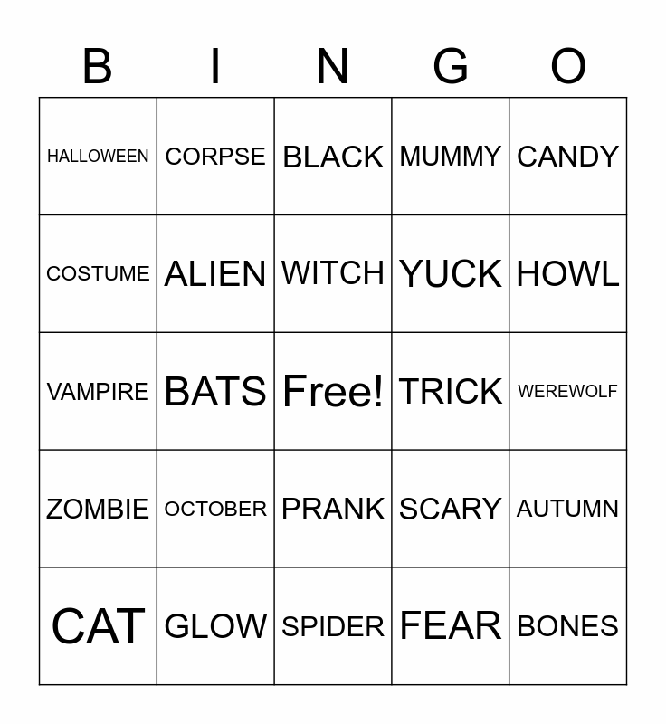 This bingo card has a free space and 49 words: TREAT, BONES, CHUCKY, SPIDER, OCTOBER, PUMPKIN, CORPSE, SCREAM, COSTUME, BOO!, ALIEN, MUMMY, AUTUMN, SCARY, POTION, HORROR, WITCH, TRICK, WEB, CANDY, BATS, FEAR, HALLOWEEN, YUCK, GHOST, HOWL, CAT, SKELETON, PRANK, ZOMBIE, GRAVEYARD, MAGIC, RATS, BLOOD, GLOW, DARK, MOON, MONSTER, WEREWOLF, FANGS, CASPER, AFRAID, CREEPY, FRIGHTEN, VAMPIRE, BLACK, CANDY CORN, SCARECROW and MASK.