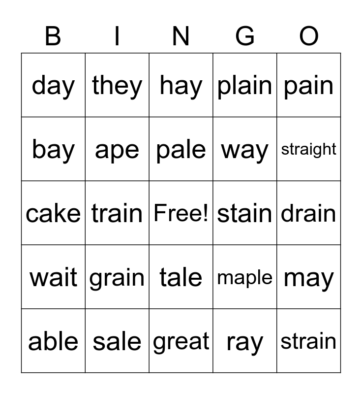 This bingo card has a free space and 40 words: make, cake, wake, ape, sale, tale, pale, rain, pain, wait, train, plain, strain, drain, stain, grain, brain, day, say, hay, may, ray, way, bay, crayon, eight, weigh, sleigh, weight, neigh, neighbour, able, table, maple, straight, great, steak, break, they and obey.
