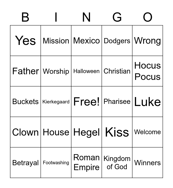This bingo card has a free space and 31 words: Roman Empire, Prodigal Son, Kierkegaard, Right, Yes, Mexico, Worship, Kiss, Pharisee, Kingdom of God, Luke, Winners, Fire, Losers, Hocus Pocus, Forgiveness, Welcome, House, Clown, Hegel, Wrong, Judas, Betrayal, Mission, Christian, Father, Dodgers, Buckets, Footwashing, Halloween and Universe.