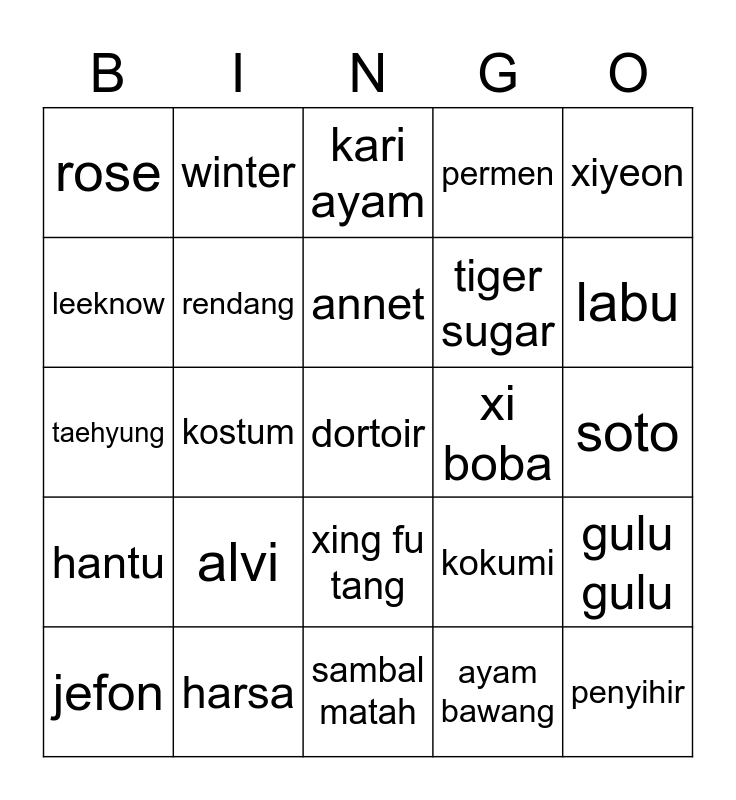 This bingo card has a free space and 24 words: alvi, harsa, annet, jefon, xiyeon, rose, leeknow, winter, xi boba, xing fu tang, tiger sugar, taehyung, kokumi, gulu gulu, rendang, ayam bawang, soto, kari ayam, labu, kostum, penyihir, hantu, permen and sambal matah.