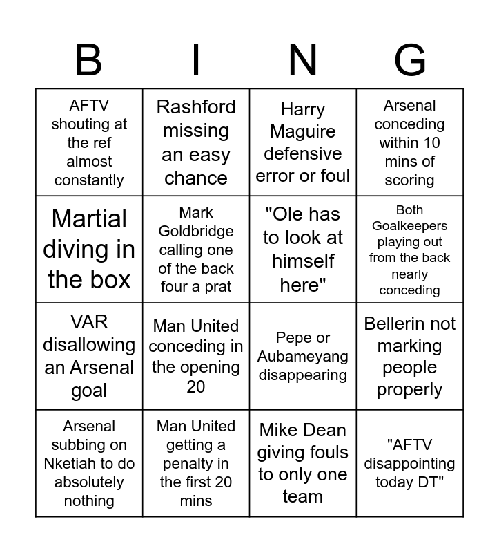 This bingo card has 16 words: Man United getting a penalty in the first 20 mins, Bellerin not marking people properly, Harry Maguire defensive error or foul, AFTV shouting at the ref almost constantly, VAR disallowing an Arsenal goal, Rashford missing an easy chance, Pepe or Aubameyang disappearing, Mike Dean giving fouls to only one team, Martial diving in the box, Mark Goldbridge calling one of the back four a prat, Arsenal subbing on Nketiah to do absolutely nothing, Arsenal conceding within 10 mins of scoring, Man United conceding in the opening 20, Both Goalkeepers playing out from the back nearly conceding, "Ole has to look at himself here" and "AFTV disappointing today DT".