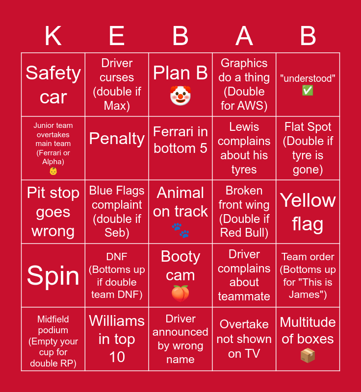 This bingo card has 25 words: DNF (Bottoms up if double team DNF), Driver announced by wrong name, Ferrari in bottom 5, Midfield podium (Empty your cup for double RP), "understood" ✅, Safety car, Junior team overtakes main team (Ferrari or Alpha) 👶, Driver curses (double if Max), Broken front wing (Double if Red Bull), Booty cam 🍑, Lewis complains about his tyres, Pit stop goes wrong, Driver complains about teammate, Team order (Bottoms up for "This is James"), Penalty, Multitude of boxes 📦, Yellow flag, Plan B 🤡, Flat Spot (Double if tyre is gone), Blue Flags complaint (double if Seb), Animal on track 🐾, Williams in top 10, Spin, Graphics do a thing (Double for AWS) and Overtake not shown on TV.