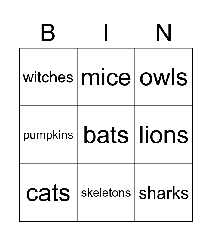 This bingo card has 14 words: spiders, ghosts, cats, mice, pumpkins, bats, sharks, rats, skeletons, witches, monsters, lions, owls and zombies.