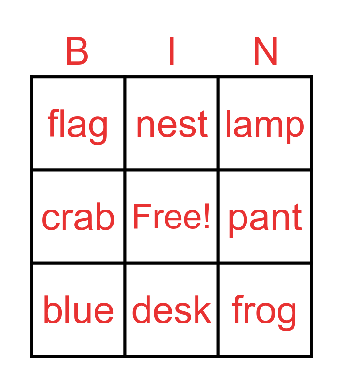 This bingo card has a free space and 8 words: pant, lamp, nest, blue, flag, frog, crab and desk.