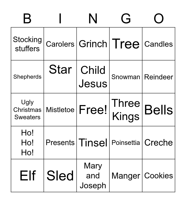 This bingo card has a free space and 49 words: Christmas stocking, Cookies, Santa Claus, Mary and Joseph, Presents, Candy cane, Carolers, Angels, Shepherds, Christmas carols, Star, Tree, Creche, Poinsettia, Holly, Yule Log, Child Jesus, Three Kings, Wreath, Candles, Mistletoe, Manger, Stocking stuffers, Snowman, Sleigh, Reindeer, Elf, Ornaments, Tinsel, Ho! Ho! Ho!, Christmas lights, Gingerbread house, Snowflakes, Nutcracker, Sled, Christmas list, Shopping, Cards, Bells, Noel, Rudolph, Snow, Egg nog, Naughty or Nice, Ugly Christmas Sweaters, Grinch, A Child Is Born, Scrooge and Bows and ribbon.