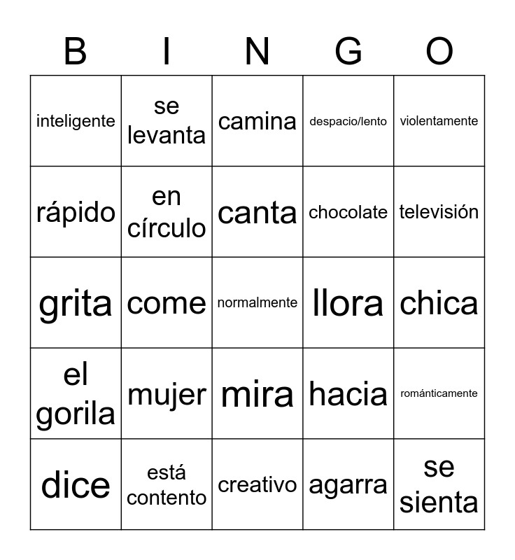 This bingo card has 32 words: agarra, le da, come, tiene, el gorila, en círculo, violentamente, románticamente, se levanta, se sienta, canta, camina, corre, se ríe, llora, bicicleta, dice, grita, mira, mujer, hacia, chico, chica, está contento, normalmente, despacio/lento, chocolate, rápido, inteligente, creativo, famoso and televisión.