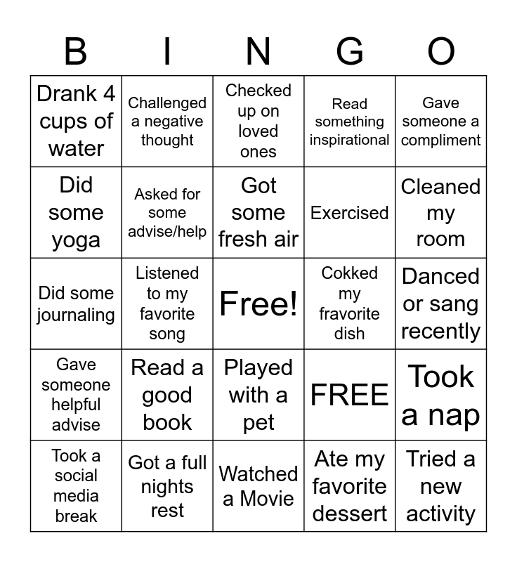 This bingo card has a free space and 25 words: Read a good book, Watched a Movie, Got some fresh air, Took a social media break, Gave someone a compliment, Drank 4 cups of water, Did some yoga, Challenged a negative thought, Cokked my fravorite dish, Played with a pet, Exercised, Did some journaling, FREE, Took a nap, Asked for some advise/help, Checked something off my to do list, Danced or sang recently, Checked up on loved ones, Cleaned my room, Listened to my favorite song, Tried a new activity, Got a full nights rest, Gave someone helpful advise, Read something inspirational and Ate my favorite dessert.