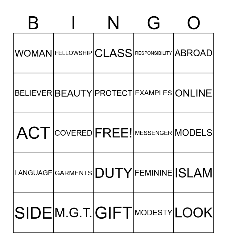 This bingo card has a free space and 35 words: RIGHTEOUS, FEMININITY, CULTURE, BEAUTY, DUTY, RESPONSIBILITY, BELIEVER, PROPER, PROTECT, HOME, ACT, ABROAD, RESTRICTIVE LAW, CLEAN, WOMAN, MESSENGER, MODESTY, COVERED, LANGUAGE, LOOK, FEMININE, SIDE, ISLAM, M.G.T., CLASS, ONLINE, GIRLS, CLOTHING, EXAMPLES, MODELS, STRENGTH, GIFT, GARMENTS, FELLOWSHIP and COMMUNICATION.