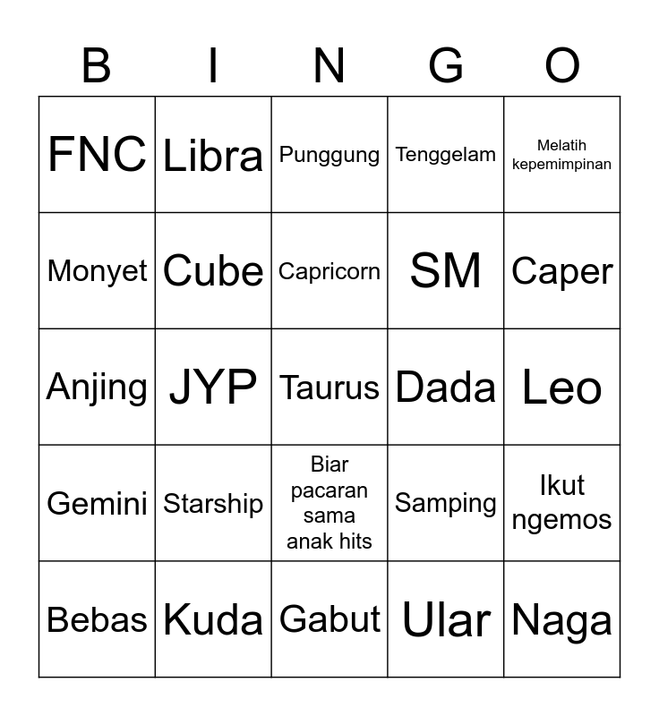 This bingo card has a free space and 24 words: Starship, Kuda, Capricorn, Bebas, Melatih kepemimpinan, FNC, Monyet, Libra, Dada, Biar pacaran sama anak hits, SM, Anjing, Samping, Ikut ngemos, Cube, Ular, Leo, Punggung, Caper, JYP, Naga, Gemini, Tenggelam and Gabut.