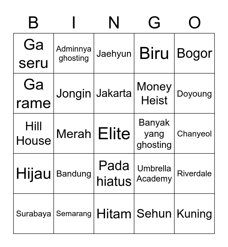 This bingo card has a free space and 24 words: Bandung, Semarang, Jakarta, Surabaya, Bogor, Ga seru, Ga rame, Adminnya ghosting, Banyak yang ghosting, Pada hiatus, Money Heist, Hill House, Umbrella Academy, Riverdale, Jongin, Sehun, Chanyeol, Jaehyun, Doyoung, Merah, Kuning, Hijau, Biru and Hitam.